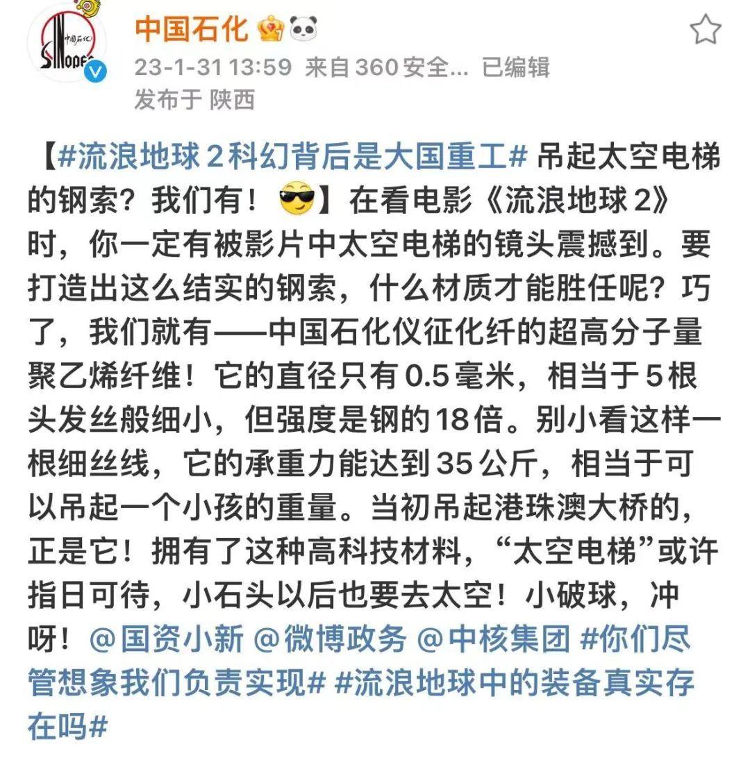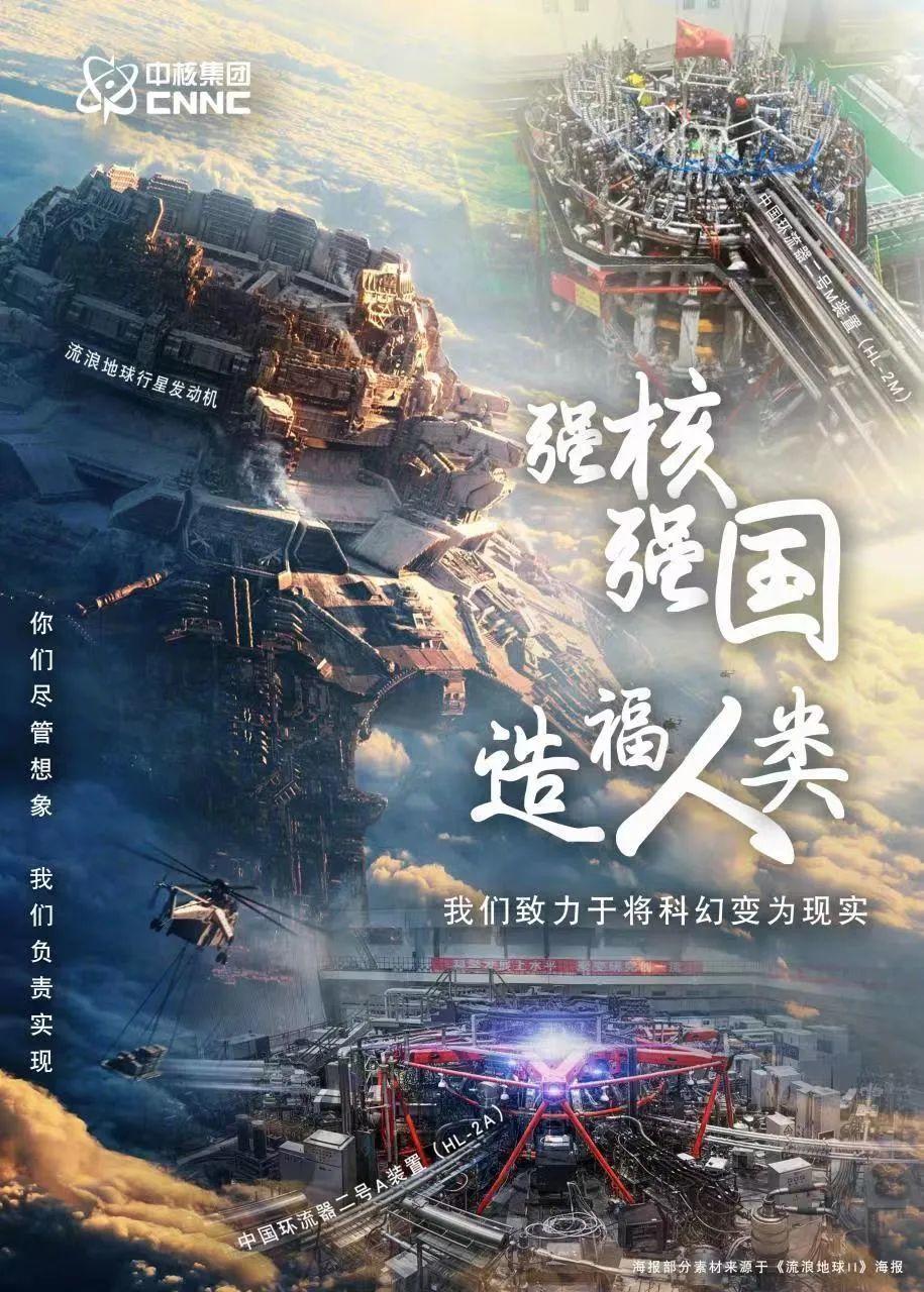 1月30日,中核集團官方賬號融合電影中的行星發動機與現實中的中國環流器二號製成海報,并配文“你們負責想象,我們負責實現”。網友不禁熱血沸騰:“最硬核夢幻聯動!”