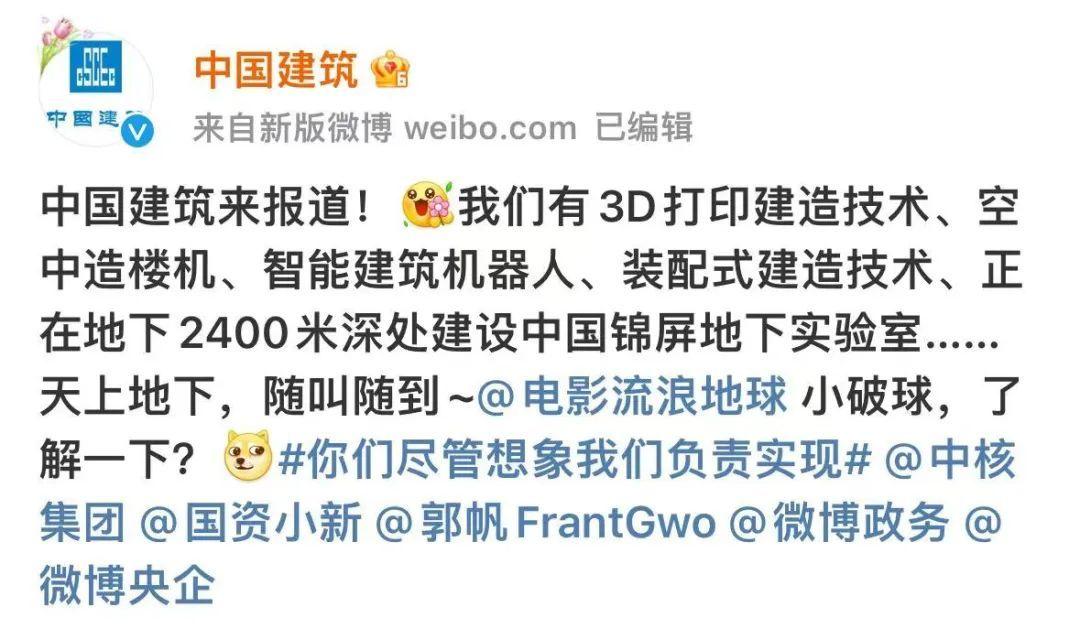 “基建狂魔”中國建築則表示:3D打印建造技術、空中造樓機等不在話下。同時還將挑戰極限:在地下2400米深處建設“中國錦屏地下實驗室”——世界岩石覆蓋最深的實驗室。