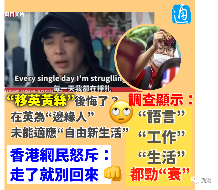 通說:到了這一步,移英港人真沒想到英國為持英國國民(海外)護照(BNO)的香港居民開放新簽證兩周年。這些人過得如何?一份來自當地的調查寫滿了“慘”字。 據美國媒體報道,一份就BNO簽證移英港人的調查發現,三成受訪者未適應新生活,大約一半受訪者表示有四項主要需求,包括瞭解英國社會習慣及融入社區、醫療服務、英語會話、工作機會及求職技巧。