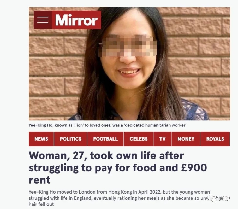 受訪者以文字寫下移英生活後的感受,孤獨、不習慣英國生活、擔心個人財政與生活開銷、不適應冬天寒冷多雨、語言障礙,成為最多人寫下的心聲,滿滿的心酸。 有不少在香港本是工程師、高級白領的中產夫婦,移民後找不到對口工作,只能看守倉庫、在超市收銀。約兩成受訪者表示,在生活開支上極度或高度需要幫助。受訪者中有多於一半是育有正在就學子女的家長或本身是學生,因需要繳付國際學生學費,擔憂負擔沉重。 據BBC的報道,不少經BNO簽證移英的港人,由於沒有永居身份,不符合享有每年上限9250英鎊(約8.8萬港元)的英國本地生學費資格,也不得申請任何政府貸款和資助。若入讀三年本科課程,每年僅學費就高達2.3萬英鎊(約22萬港元)。 BNO簽證申請者無法取回強積金,也影響他們的財政狀況。強積金是香港打工仔的退休金小金庫。BNO護照不獲政府承認作為有效旅行證件和身份證明,因此,他們并不能以此作為申請提早提取強積金的證據,唯有熬到65歲才能取出退休金。 實際上,港人移英後的生計窘迫、備受歧視,日子并不好過,也沒有得到太多英方的幫助。 不久前,一名才移英7個月的27歲香港女碩士,面對沉重生活壓力,應付房租有困難,最後自殺身亡。她生前透露飽受憂鬱症、失眠、掉發、共用衛生間環境臟亂、物價、租金與可能被解雇的壓力所苦,遺物中發現一本詳載每天每餐花費、疑似為省錢的筆記本。