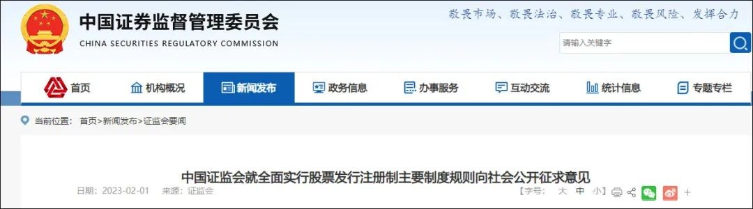 重磅!中國證監會:2月1日啟動全面實行股票發行註冊制改革香港新闻网2月2日电 据中國證監會官方網站消息,2月1日,中國證監會就全面實行股票發行註冊制主要制度規則向社會公開徵求意見。證監會指出,2023年2月1日,全面實行股票發行註冊制改革正式啟動。 對於本次改革在改進主板交易制度方面有哪些重要舉措?證監會表示,本次改革借鑒科創板、創業板經驗,以更加市場化便利化為導向,進一步改進主板交 易制度。主要措施:一是新股上市前5個交易日不設漲跌幅限制。二是優化盤中臨時停牌制度。三是新股上市首日即可納入融資融券標的,優化轉融通機制,擴大融券券源範圍。 需要說明的是,這次改革從主板實際出發,對兩項制度未作調整。一是自新股上市第6個交易日起,日漲跌幅限制繼續保持10%不變。主要考慮是,從實踐經驗看,主板存量股票及新股第6個交易日起波動率相對較低,10%的漲跌幅限制可以滿足絕大部分股票的定價需求。二是維持主板現行投資者適當性要求不變,對投資者資產、投資經驗等不作限制。