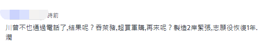 還有網友表示,2016年底蔡英文也跟美國總統當選人特朗普通了電話,結果呢?“吞‘萊豬’,超買軍購。再來呢?製造兩岸緊張,志願役恢復1年。”