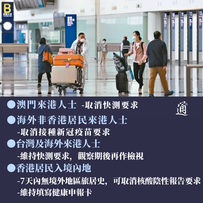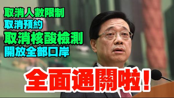 香港新聞網2月3日電 香港行政長官李家超今日(3日)上午主持香港與內地全面通關記者會,宣布香港與內地會在2月6日開始全面“通關”。所有口岸不設人數限制,不需預約,可以隨意出行,並會取消出入境前核酸檢測的要求,意味著不需要再做核酸檢測或其他檢測,可隨意隨時出行。 李家超表示,下周一(6日)起開放全部出入境口岸,即加開包括羅湖口岸、香園圍/蓮塘口岸,以及落馬洲/皇崗口岸,而沙頭角口岸的貨運服務亦會恢復。由同日開始,取消澳門來港前要進行快測的要求,即隨時隨意可以來香港或者前往澳門。 至於海外方面,亦在同日,取消非香港居民來港要有疫苗接種的要求,即沒接種疫苗的海外人士,都可來港。海外以及台灣來港前的快測要求,由於與內地全面通關會帶來大量人流往來,為確保風險可控,會將海外來港前的快測要求維持一段觀察期,之後再作檢視。