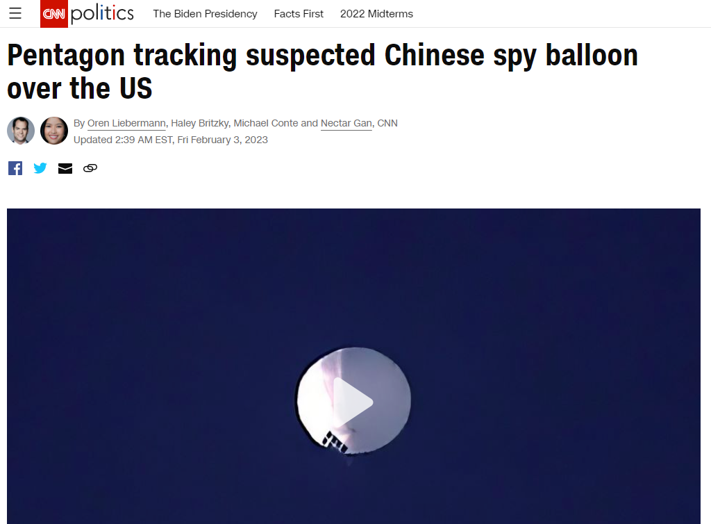 CNN報道截圖 “美國政府已經發現並正在追蹤一個高空偵察氣球,它正在美國本土上空飛行。”路透社引述五角大樓發言人帕特里克·萊德的話稱,“氣球目前的飛行高度遠高於民用航空交通(高度),不會對地面人員構成軍事或人身威脅。”據CNN報道,萊德稱,他們“確信”這個氣球屬於中國,美方在過去數年裡遇到過類似情況。他還說,盡管該氣球的飛行路線經過“一些敏感地點”,但它並未構成重大情報收集風險。 路透社說,根據一名美國官員的說法,該氣球在進入美國本土之前曾在美國阿拉斯加州阿留申群島及加拿大附近上空被追蹤到。美國國防部長奧斯汀曾在2月1日召集五角大樓高級官員就該氣球事件進行討論。同日,美國軍方領導層考慮在美國蒙大拿州上空擊落氣球,但由於氣球碎片存在安全風險,最終建議總統拜登不要這麼做。 對於美國軍方的指控,空氣動力學家黃志澄3日接受《環球時報》採訪時介紹稱,在本世紀中,美國空軍提出了一個新的戰鬥領域,名叫臨近空間,也稱之為近太空,“美國在該領域的戰鬥武器是指臨近空間內低速、長時間飛行的飛行器,包括飛艇,氣球和高空無人機,美國在氣球和飛艇方面做了大量研究,主要功能是用於偵察和通信。但美國至今還並沒有廣泛使用這項技術,因為臨近空間屬於領空的一部分,當氣球或者飛艇侵入他國領空時,對方可以將其擊落。” 黃志澄認為,按照美國公佈的數據,該氣球體積約有40米左右,而且可以“從中國飛到美國”,長距離的可控的飛行,“目前世界上能製造出這樣大體積的氣球,並且是可控飛行的,那麼只有美國和中國了。如果美國有確切證據能證明這隻氣球屬於中國,表明中國在該領域的技術已經領先美國。”黃志澄認為,美國是有能力利用衛星,飛機對該氣球進行偵察,應該提出更直接的證據來顯示這隻氣球來自中國,而不是空口無憑地指責。 中國軍事專家張學峰3日對《環球時報》表示,美國指稱該氣球“可能屬於中國”毫無根據,不排除是美國自導自演鬧劇的可能。氣球仍然在高空,目前美國的識別手段無法識別該氣球的國別,“建議美國將該氣球擊落,找到一些蛛絲馬跡後再來指責別國。” 張學峰指出,氣球的可控性差,搭載的設備裝備少,中國有衛星網絡,用氣球偵察美國本土沒有意義。(完) 【編輯:李雪萍】