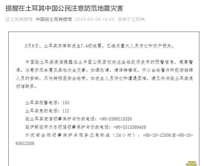 香港新聞網2月7日電 中國駐土耳其使館微信公眾號2月6日發佈公告,提醒在土耳其中國公民注意防範地震災害。 2月6日,土耳其東南部發生7.4級地震,已造成重大人員傷亡和財產損失。 中國駐土耳其使館提醒在土中國公民密切關注當地政府發佈的預警信息,提高警惕,注意防範餘震及其他次生災害。如遇險情,請保持鎮定,聽從當地警方和現場指揮人員的安排,盡快轉移至安全地帶。如發生人員傷亡和遭遇困難,請及時與駐土耳其使領館聯繫。 土耳其報警電話:155 土耳其急救電話:112 駐土耳其使館領事保護與協助電話:+90-5388215530 駐伊斯坦布爾總領館領事保護與協助電話:+90-5313389459 外交部全球領事保護與服務應急熱線(24小時):+86-10-12308或+86-10-65612308