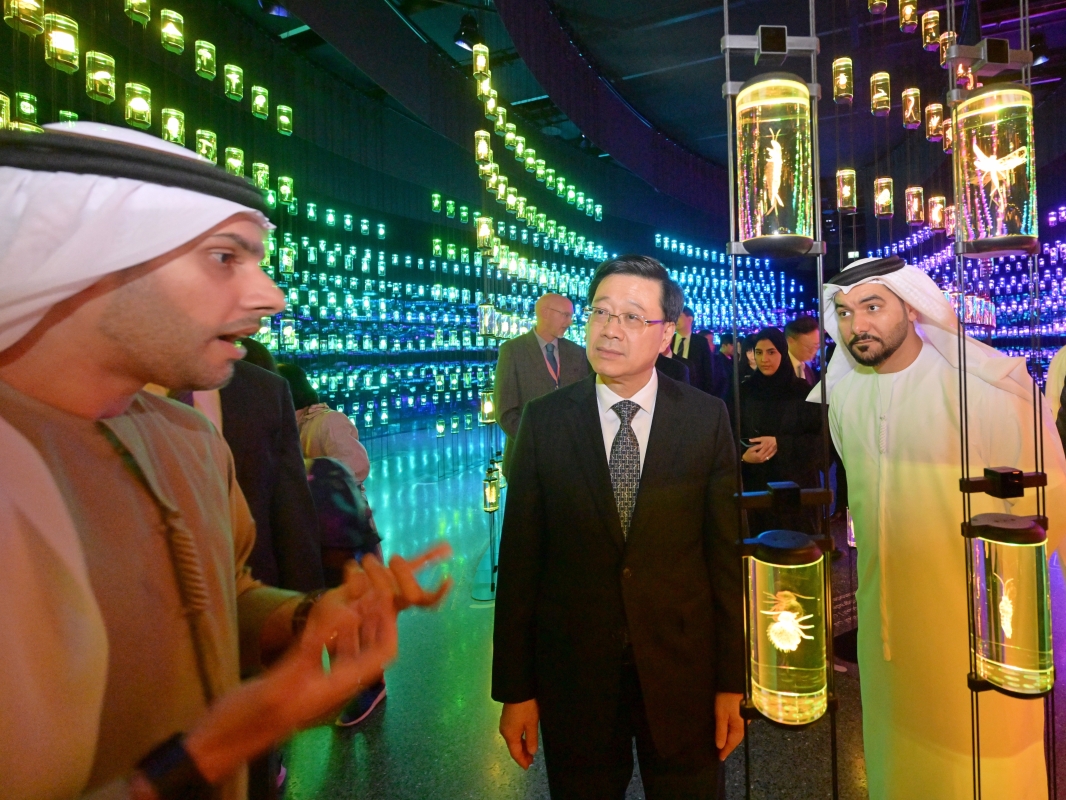 李家超(中)聽取博物館工作人員的簡介。 李家超指出,阿聯酋在2021年是香港的第14大貿易伙伴,兩地貿易額較2020年增加35%至約128億美元。早在2020年,香港已經是阿聯酋的第9大貿易伙伴,兩地的雙邊貿易於2017年至2021年期間平均按年增加4.1%。截至2022年11月,共有36間阿聯酋企業在香港設立辦事處,其中有4間為地區總部,可見兩地之間的商機潛力無窮。 其後,李家超率領香港特別行政區代表團到迪拜未來博物館參觀。該博物館由穆罕默德.阿勒馬克圖姆創立的迪拜未來基金會籌建,融合傳統展覽、劇院和主題景點元素,讓參觀者探索社會未來如何利用科技發展。李家超指出,中央明確支持香港建設國際創新科技中心,香港已於去年公布《香港創新科技發展藍圖》,為未來5至10年的創科發展制訂清晰的發展路徑和系統的戰略規劃,他期望香港日後能與迪拜未來基金會在創新科技方面增進合作。 參觀期間,李家超與阿聯酋人工智能、數字經濟和遠程工作應用國務部長及迪拜未來基金會副常務董事Omar bin Sultan Al Olama見證香港數碼港與迪拜未來基金會簽署合作備忘錄,為雙方科技合作交流奠定基礎。(完) 【編輯:孟宜君】