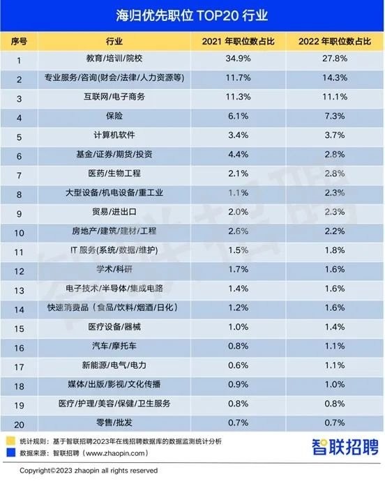 調研顯示,回國求職的“海歸”中,58%認為“國內生活更加便利”,40%因“更認同國內的文化環境”決定回國,32%則認為“國內就業機會更多”。 根據報告的觀察,防疫政策調整後,國內企業對海外人才的需求快速釋放,各地政府也積極組織當地企業出國引才,因此對“海歸”人才的需求呈上升趨勢。 從行業看,2022年“海歸優先崗位中,來自教育/培訓行業的職位數佔比27.8%,位居第一位,專業服務/咨詢、互聯網/電子商務行業分別以14.3%、11.1%分列二三。