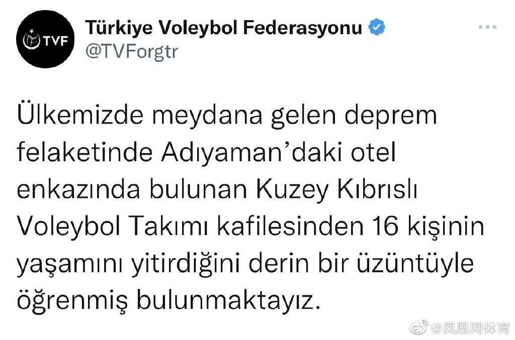 香港新聞網2月11日電 土耳其排球聯合會宣布,在阿德亞曼酒店廢墟中找到的一支女子排球隊的16人全部遇難。 此前據土耳其《新黎明報》報道,土耳其2月6日強震後,該國足球、排球等項目多名運動員在土耳其失聯。一支女排隊伍16名成員都被埋在廢墟下。目前,經證實全部球員都已遇難。 土耳其排球聯合會公布了噩耗:“得知在阿德亞曼酒店廢墟中發現的塞浦路斯排球隊的16名隊員全部遇難,我們深感悲痛。”這個消息是不可接受的。