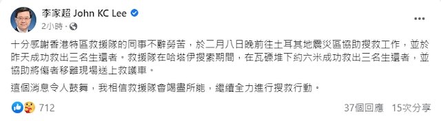 李家超說,十分感謝香港特區救援隊的同事不辭勞苦,於二月八日晚前往土耳其地震災區協助搜救工作,並於昨天(2月11日)成功救出三名生還者。 對於搜救細節,李家超指,救援隊在哈塔伊搜索期間,在瓦礫堆下約六米成功救出三名生還者,並協助將傷者移離現場送上救護車。“這個消息令人鼓舞,我相信救援隊會竭盡所能,繼續全力進行搜救行動。”
