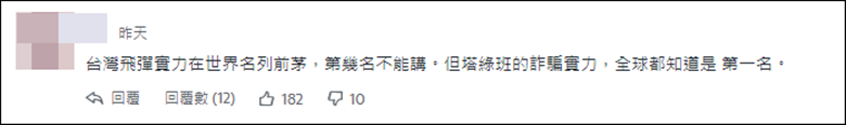 “台灣飛彈實力在世界名列前茅,第幾名不能講。但塔綠班的詐騙實力,全球都知道是第一名。”