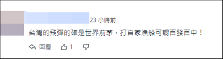 還有人揶揄道:“台灣飛彈的確是世界前茅,打自家漁船可謂百發百中!” 據台媒過往報道,2016年,台灣海軍“金江艦”在海軍左營軍港誤射一枚“雄三”導彈,擊中在澎湖海域作業的高雄籍“翔利升”漁船,造成船長黃文忠死亡、同船3名船員受傷。
