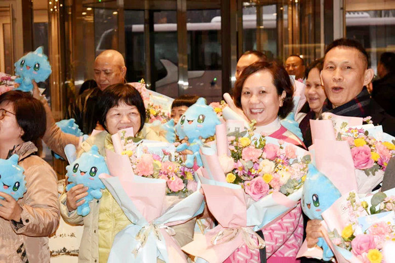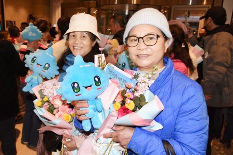 2月12日,來自香港的游客黃麗深(右)在歡迎儀式上展示收到的鮮花和玩偶。新華社圖 【編輯:許豐悅】