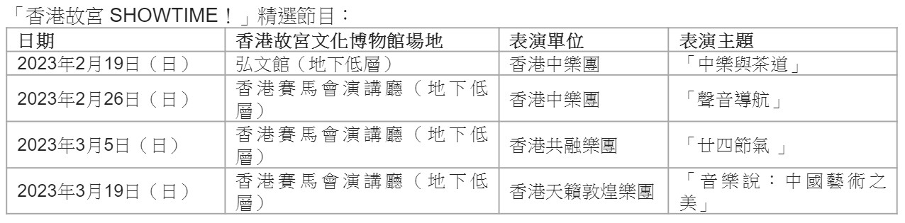 “香港故宮SHOWTIME!”一連串免費表演藝術節目迎公眾 除了欣賞展覽,每星期日訪客更可體驗一系列表演藝術節目——“香港故宮SHOWTIME!”,節目由香港故宮與香港本地多個表演藝術團體及藝術家合作策劃、以中國文化藝術為主題,自推出以來一直廣受訪客歡迎,至今已吸引近9,000人次入場觀賞。“香港故宮SHOWTIME!”由博物館戰略合作夥伴——中國銀行(香港)贊助,節目旨在透過音樂、舞蹈和戲劇等精彩節目,讓公眾體驗、欣賞和探討故宮文化,認識中國藝術。精彩節目費用全免,訪客須於博物館網站上預約登記參加(網址:www.hkpm.org.hk/tc/event#performance)。