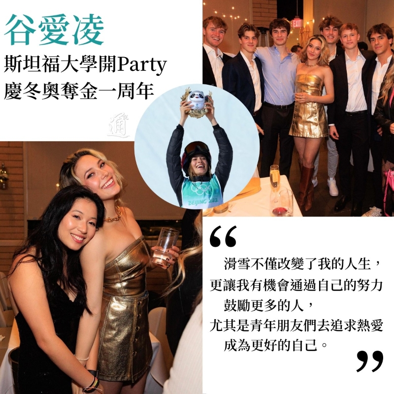 谷愛凌大學校園開派對,慶祝冬奧奪金一周年(圖片:谷愛凌IG) 谷愛凌在社交平台上分享多張照片,她邀請朋友們一同慶祝北京冬奧會奪得金牌一周年。同時感謝所有人,“這讓一切變得難以忘懷”。 在美國斯坦福(史丹福)大學校園裏,谷愛凌把相關的活動舉辦得十分隆重。她本人也花了一番心思,甚至在聚會期間換了兩套禮服出席。她感言:“時間過得太快了!我也成長了許多。一年前的今天,我打破了自己的界限,成為了奧運會大跳台歷史上第一個金牌獲得者。感恩滑雪不僅改變了我的人生,更讓我有機會通過自己的努力鼓勵更多的人尤其是青年朋友們去追求熱愛,成為更好的自己。感謝你們對我的支持。讓我們一起為未來加油!讓世界變得更好。”