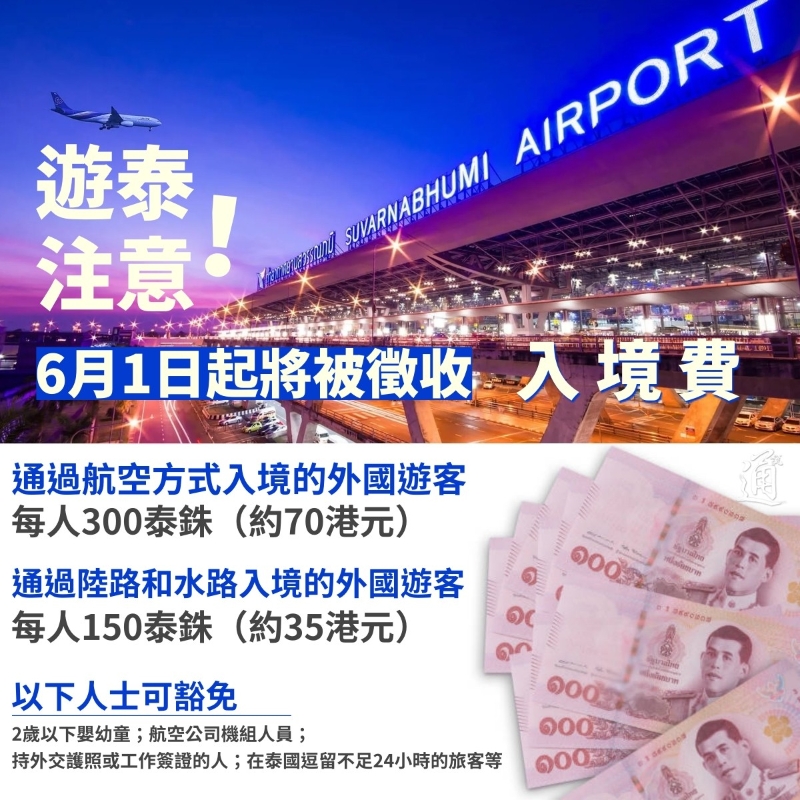 泰國6月開徵入境費(圖片:泰國國家旅遊局) 入境費徵收標準分為兩種:對通過航空方式入境的外國遊客徵收300泰銖(約70港元、60元人民幣)/人,對通過陸路和水路方式入境的外國遊客徵收150泰銖(約35港元、30元人民幣)/人。新收費不適用於2歲以下幼童和機組人員,及持外交護照或工作簽證的人等,在泰國逗留不足24小時的旅客亦可獲豁免。 當局預計開徵入境費後,今年會為庫房帶來39億泰銖(約9億港元)額外收益。據泰國旅遊和體育部介紹,外國遊客支付的入境費將用於支付遊客在泰國期間的保險費、公共衞生管理費以及促進旅遊事業發展的費用。