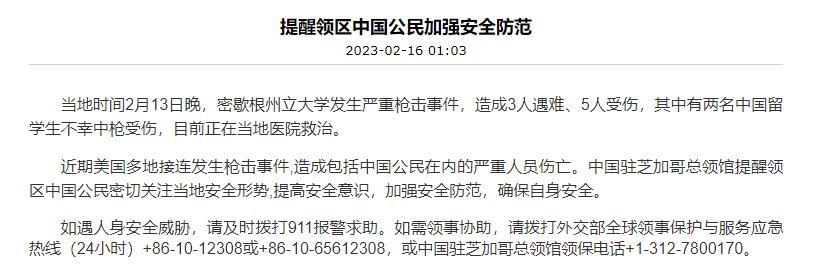 香港中通社2月16日電 據中國駐芝加哥總領館網站16日消息,當地時間13日晚美國密歇根州立大學發生的嚴重槍擊事件造成3人遇難、5人受傷,其中有兩名中國留學生不幸中槍受傷,目前正在當地醫院救治。