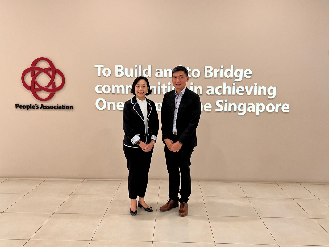 麥美娟(左)與卓榮能於人民協會合照 完善地區治理及回應地區需求為本屆特區政府的重要工作。麥美娟聽取了人民協會簡介新加坡當地透過不同平台,包括社區發展理事會和民眾俱樂部等聯繫社區的經驗,並交流香港在地區治理方面的工作。