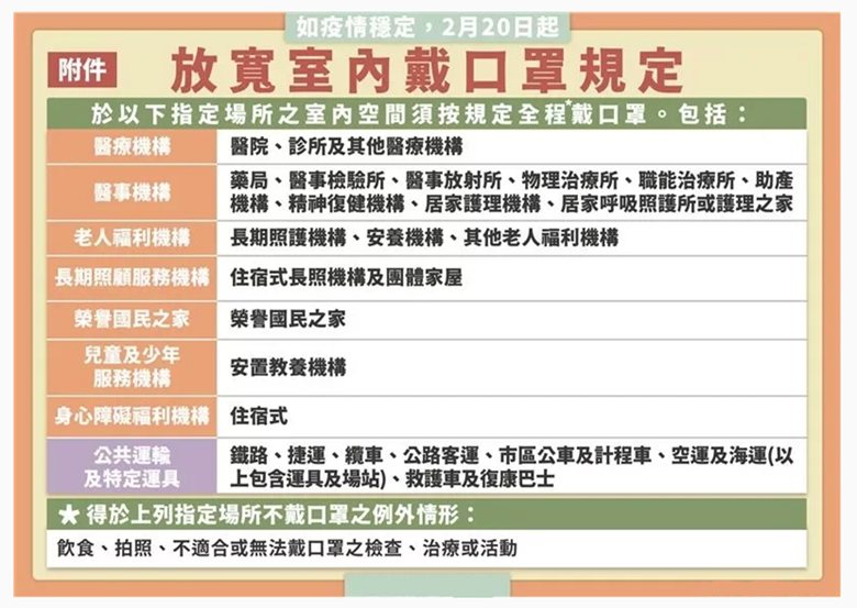 台灣地區今起解除室內口罩禁令香港新聞網2月20日電 據台媒最新消息,台灣地區流行疫情指揮中心宣布,台灣地區執行了812天的室內口罩禁令今天(2月20日)走入歷史,僅剩公共運輸系統、醫療照護等八大場域仍需強制配戴。但台灣中國醫藥大學附設醫院感染管制中心副院長黃高彬表示,口罩解禁意義不大,因大部分民眾仍會自主配戴,流行疫情指揮中心當務之急是將新冠肺炎自傳染病降級,將無呼吸道症狀的確診病人回歸本科治療,而非直接送專責病房,造成醫療閒置或浪費。