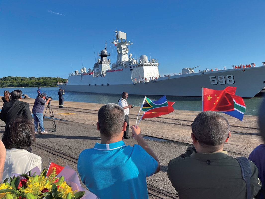 中國海軍日照艦19日抵達南非理查茲灣港口,受到當地華人華僑熱烈歡迎。 鄒鬆 攝 中方派出位於亞丁灣執行第42批護航任務的052D導彈護衛艦淮南號、054A導彈護衛艦日照號、903型綜合補給艦可可西里湖號參演。中國國防部稱,聯合演習有助於進一步推動金磚國家防務安全領域合作,提升參演各方共同維護海上安全能力。
