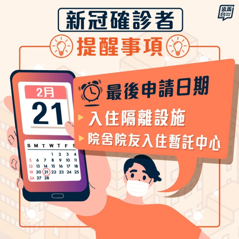 香港新聞網2月21日電 特區政府早前已公布,有關新冠確診者自願入住隔離設施的過渡安排,將維持至本月底、即2月28日。若以確診者最多逗留7天計算,今日(21日)將是最後申請入住的日子。負責接送安排的消防處指定熱線,亦會於明日停止運作。 此外,為檢測陽性院舍院友提供服務的暫託中心,最後申請日亦為今日。