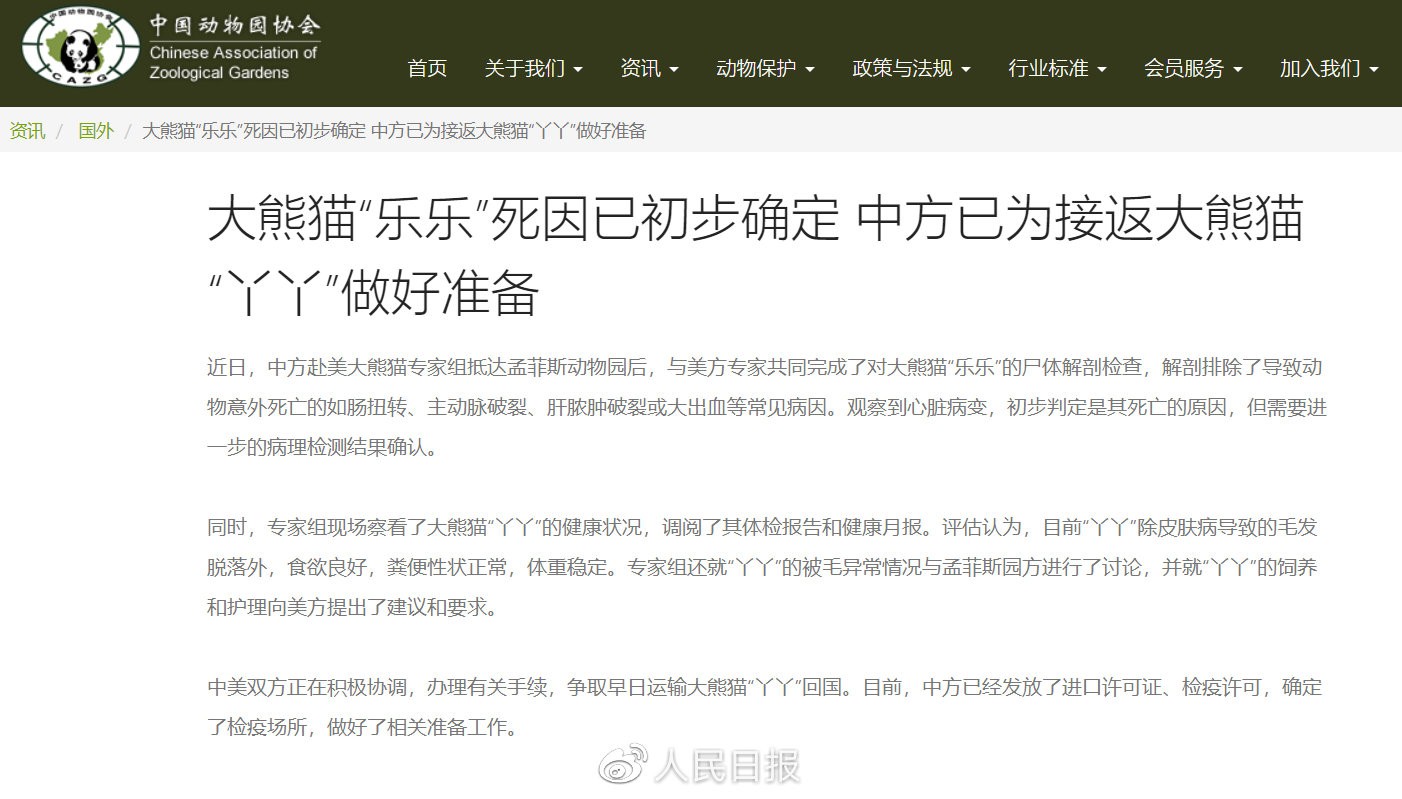 中國動物園協會發佈旅美大熊貓“樂樂”死因。圖源:人民日報微博 同時,專家組現場察看了大熊貓“丫丫”的健康狀況,調閱了其體檢報告和健康月報。評估認為,目前“丫丫”除皮膚病導致的毛髮脫落外,食欲良好,糞便性狀正常,體重穩定。專家組還就“丫丫”的被毛異常情況與孟菲斯園方進行了討論,并就“丫丫”的飼養和護理向美方提出了建議和要求。