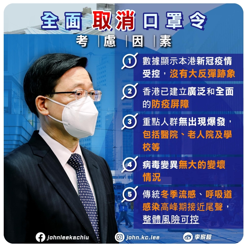 李家超又指,明天起香港全面復常,將全面拼經濟、拼發展。香港不同盛事活動都會回來,香港的社會活動亦會“活起來、動起來”。 盧寵茂說,全面撤銷口罩令是基於疫情已受控。他指出,無論污水檢測及死亡個案均保持在低位,感染個案及流感個案亦未見上升,加上醫院及學校未有大爆發。他又說,流感高峰未完結,但已經是尾聲,預料感染個案雖然會上升但持續期短暫,強調是風險可控。 盧寵茂指出,特區政府全面撤銷口罩令,是基於局部保留的防疫效果不大,亦難以執法,同時為市民帶來不便,因此決定全面撤銷。不過,衛生防護中心會發生健康忠告,呼籲長期病患等高危人士,在空氣流通地方仍要保持佩戴口罩。 香港特區政府在2020年7月15日起實施口罩令,即市民在公共交通、港鐵付費區域公、指定處所及指明眾地方必須佩戴口罩。不過,其實在香港爆發疫情初期,已經有不少市民自覺佩戴口罩,並掀起搶購口罩潮。