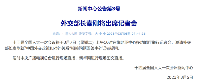 香港新聞網3月6日電 據十四屆全國人大一次會議新聞中心,十四屆全國人大一次會議將於3月7日上午10時在梅地亞中心多功能廳舉行記者會,邀請外交部長秦剛就“中國外交政策和對外關係”相關問題回答中外記者提問。