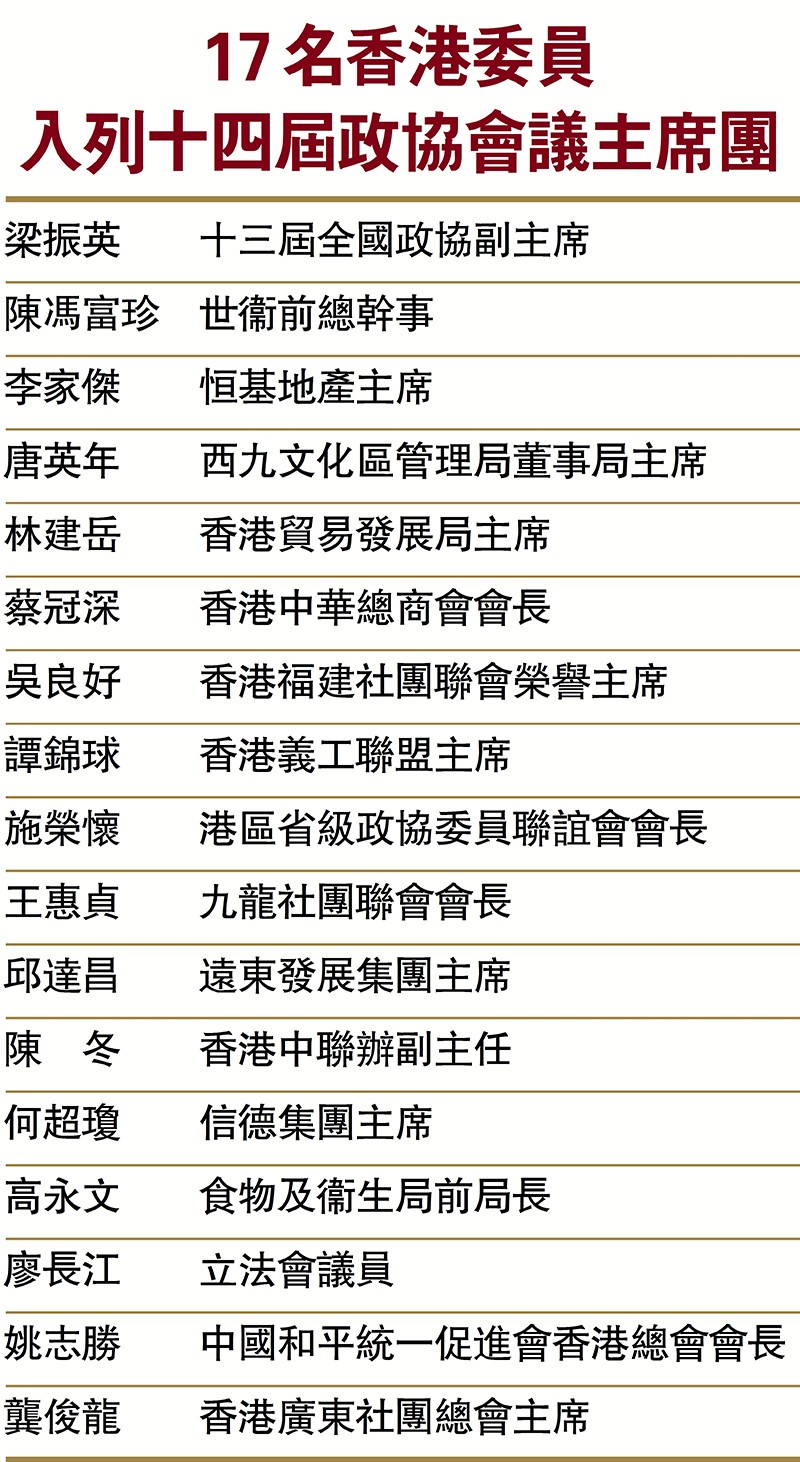 製圖:香港文匯網 其他入選主席團名單的港區委員還包括多位第十三屆全國政協常委,包括世衞前總幹事陳馮富珍、恒基主席李家傑、西九文化區管理局董事局主席唐英年、香港貿易發展局主席林建岳、香港中華總商會會長蔡冠深、香港福建社團聯會榮譽主席吳良好、香港義工聯盟主席譚錦球。 陳冬新入選今年政協主席團名單,還有多位全國政協專委會副主任,包括人口資源環境委員會副主任、港區省級政協委員聯誼會會長施榮懷,全國政協提案委員會副主任、九龍社團聯會會長王惠貞,全國政協社會和法制委員會副主任、遠東發展集團主席邱達昌。 多位全國政協委員包括信德集團主席何超瓊、前特區政府食物及衞生局局長高永文、立法會議員廖長江、中國和平統一促進會香港總會會長姚志勝、香港廣東社團總會主席龔俊龍等亦加入了主席團。(完) 【編輯:王軼南】