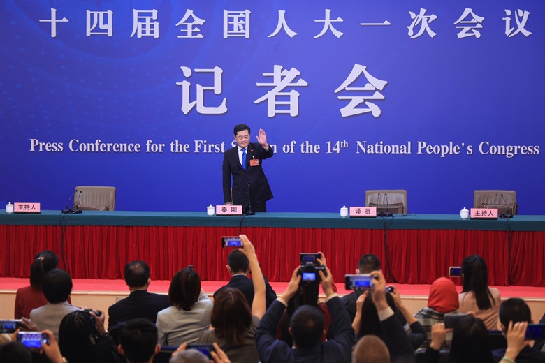3月7日上午記者會現場,中國外交部長秦剛在記者會開始前,向媒體問好。香港中通社記者 許其皓攝 【秦剛:關於台海局勢,中國人民有權問幾個問題】 鳳凰衛視記者:近一段時間以來美國一些智庫和官員持續炒作中美在台海發生衝突,一些人士甚至預測衝突的時間就在2027年或者2025年。還有媒體爆料稱,美國已經制定了“摧毀台灣”的計劃。請問您如何看待當前台海局勢?您認為中美在台海發生衝突的風險有多大? 秦剛:我知道今天肯定要問到台灣問題,特別帶來一本《中華人民共和國憲法》。我首先引用《中華人民共和國憲法》序言里的兩句話:“台灣是中華人民共和國的神聖領土的一部分。完成統一祖國的大業是包括台灣同胞在內的全中國人民的神聖職責。”解決台灣問題是中國人自己的事,任何外國都無權干涉。最近美國高官聲稱台灣問題不是中國內政,對此我們堅決反對并保持高度警惕。 對於兩岸來說,我們都有一個家,名字叫中國。作為骨肉同胞,我們將繼續以最大誠意、盡最大努力實現祖國和平統一。同時,保留采取一切必要措施的選項。中國《反分裂國家法》對此規定得很明確。如果出現了違反該法的情況,我們必須依憲依法行事。任何人都不要低估中國政府和中國人民捍衛國家主權和領土完整的堅強決心、堅定意志和強大能力。 台灣問題是中國核心利益中的核心,是中美關係政治基礎中的基礎,是中美關係第一條不可跨越的紅線。台灣問題之所以產生,美國負有不可推卸的責任。我們之所以同美國談台灣問題,是要求美方不要幹涉中國內政。 中國人民有權問:為什麼美方在烏克蘭問題上大談尊重主權和領土完整,卻在中國的台灣問題上不尊重中國的主權和領土完整?為什麼一邊要求中國不向俄羅斯提供武器,一邊卻長期違反“八·一七”公報向台灣售武?為什麼一邊口口聲聲說維護地區和平穩定,一邊卻暗地里制定了所謂“摧毀台灣”的計劃? “台獨”分裂與台海和平穩定水火不容。台海和平穩定的真實威脅是“台獨”分裂勢力,定海神針是一個中國原則,真正的護欄是中美三個聯合公報。台灣問題處理不好,中美關係地動山搖。 如果美方真的希望台海風平浪靜,就應該停止“以台制華”,回歸一個中國原則的本源本義,恪守對中國作出的政治承諾,明確反對和制止“台獨”。