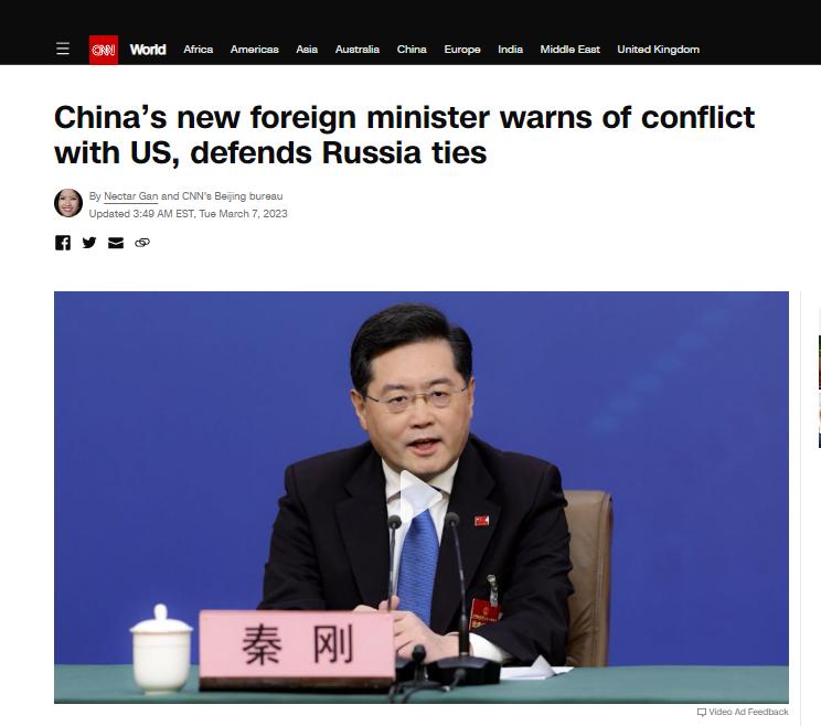 全國兩會 | 外長秦剛兩會“首秀”,外媒怎麼看?香港新聞網3月8日電 每年外長記者會都是全國兩會上的熱點。本次是秦剛首次作為外交部長亮相全國兩會,中外媒體都對這位中國新任外長充滿好奇。3月7日的首秀,秦剛共回應14個問題,其中中美關係是焦點。外界曾指他在擔任外交部發言人時就以“剛猛、直接”著稱,而他的外長首秀也是如此。那麼外媒對這場外長記者會的反應如何呢? 對大國關係的總體評價 美國有線電視新聞網(CNN)評價稱,“在這場記者會上,秦剛為中國未來一年及以後的外交政策定下基調,譴責美國加劇雙邊緊張局勢,並捍衛北京與莫斯科的密切夥伴關係。”對於中美關係,CNN表示“世界上兩個最大經濟體之間的關係幾十年來處於最糟糕的狀態。” 美國全國廣播公司商業頻道(CNBC)則提到,“秦剛在周二,把北京與莫斯科的關係作為中國與其他國家關係的範例來講述。” 外媒關注秦剛發言中的哪些熱點事件? 熱氣球事件 秦剛在記者會上回應熱氣球事件時說:“美國對華認知和定位出現了嚴重偏差,把中國當成最主要對手和最大地緣政治挑戰。” 英國廣播公司(BBC)提到,“間諜氣球事件加劇了兩個超級大國之間原本在努力改善當中的緊張關係。” CNN則指,“上月,一個疑似中國間諜派來的氣球在北美上空漂浮,隨後被美國戰鬥機擊落,兩國緊張局勢進一步加劇。” 俄烏衝突 秦剛在記者會上回應俄烏衝突時說:“中國不是烏克蘭危機製造者,憑什麼向中國甩鍋推責?” BBC直指,“秦先生表示,一隻看不見的手正在推動烏克蘭危機,但沒有說出任何國家或個人的名字。” CNN稱,“中國與莫斯科日益增長的夥伴關係,使其與西方的緊張關係進一步加劇。”