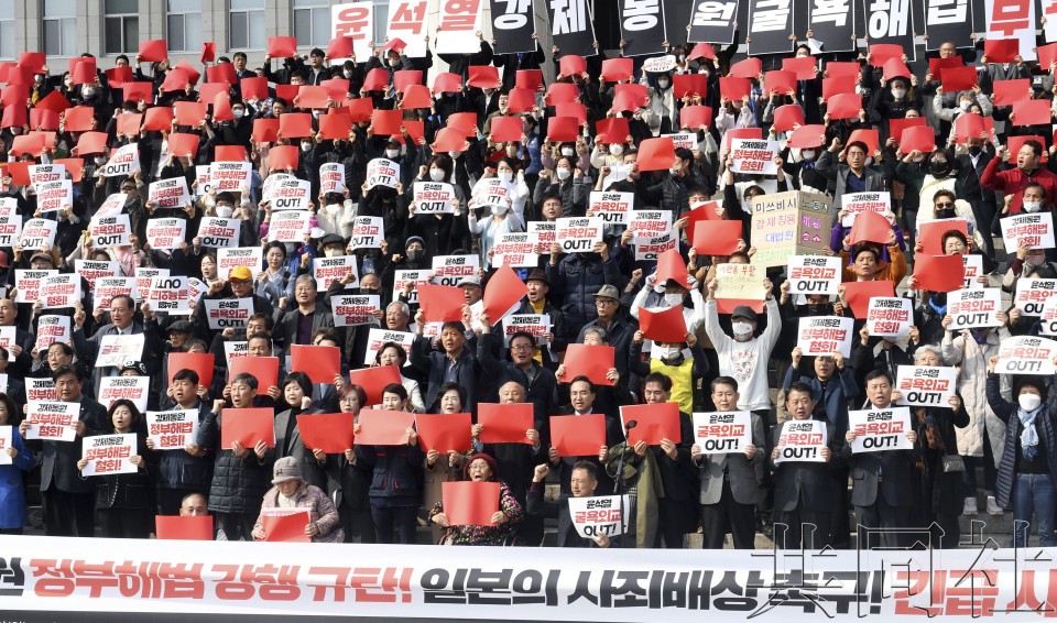 香港新聞網3月8日電 鑒於韓國政府公佈了由政府旗下財團代替被告日企支付賠償的方法來解決二戰被征勞工的訴訟問題,在野黨議員和原告等7日舉行抗議集會。多個市民團體參加了集會,數百人高喊“聲討屈辱外交”的口號。確定勝訴的原朝鮮女子勤勞挺身隊員要求“日本道歉”。儘管總統尹錫悅強調“韓日兩國的共同利益”,但國內反對聲或將持續。