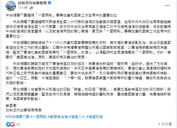 曾國衞。 曾國衞在社交平台發文,指中央領導的講話總結了十八大以來黨和國家事業發展的成就,其中提到香港由亂到治,由治及興是國家過去5年工作的突出重點,凸顯中央考慮香港問題從來是從國家戰略高度,以香港長期繁榮穩定為基礎。堅定了香港社會對國家發展和“一國兩制”的信心,必須堅持和全面準確貫徹“一國兩制”方針,落實好“愛國者治港”原則,鞏固好良政善治的局面。