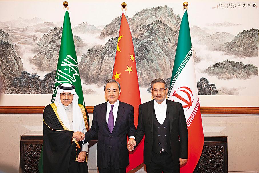 中國成功推動沙特伊朗復交 三方簽署發表聯合聲明香港新聞網3月11日電 在中方支持下,沙特阿拉伯和伊朗於3月6日至10日在北京舉行對話。中共中央政治局委員、中央外辦主任王毅昨(10)日在北京主持沙特阿拉伯和伊朗對話閉幕式,沙特國務大臣兼國家安全顧問艾班、伊朗最高國家安全委員會秘書沙姆哈尼出席。沙伊兩國達成北京協議,中沙伊三方簽署並發表聯合聲明,宣布沙伊雙方同意恢復外交關係,強調三方將共同努力,維護國際關係基本準則,促進國際地區和平與安全。