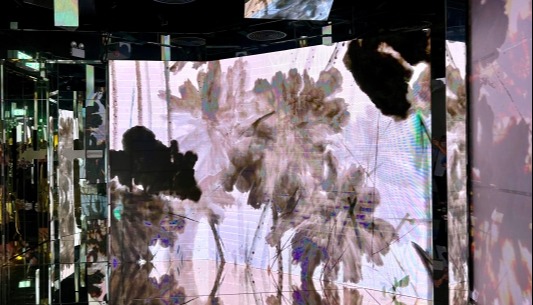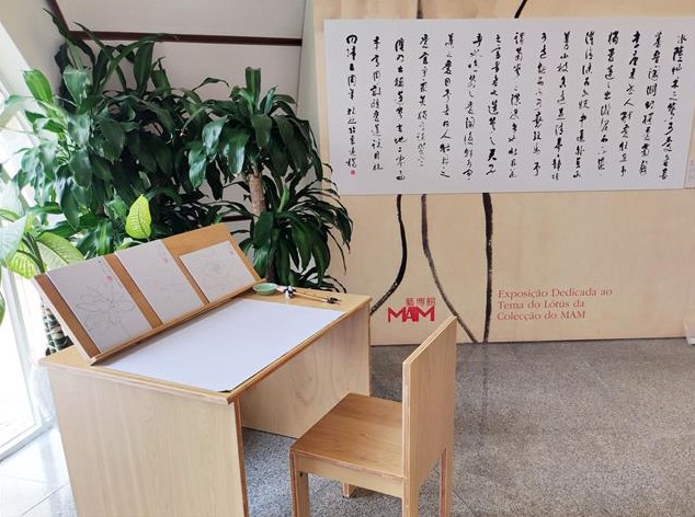 展廳一隅 展覽同時設有“蓮花苑內繪蓮花”親子活動區,公眾可以參照澳門藝博館館藏荷花畫稿,現場以水寫布體驗繪畫蓮花的樂趣。