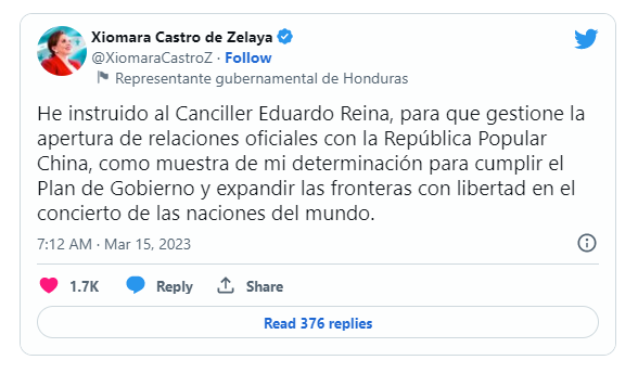 洪都拉斯總統Xiomara Castro的3月14日推文。 這則消息今日(3月15日)也被多家台媒關注到。台灣“中央社”、台灣《經濟日報》、綠媒《自由時報》等媒體第一時間發佈了相關報道。 島內綠媒“三立新聞網”稱,近日台洪“邦交”生變議題再度受到輿論關注“投下震撼彈”。台灣TVBS新聞網報道標題則為:“斷交危機?我‘友邦’洪都拉斯總統:尋求與中國建立正式關係”;中時新聞網標題中出現“我邦交國減1?” 對此,島內網友也紛紛發表自己 的看法。 有網友表示:遲早的事,巴拉圭也許是下一個。↓