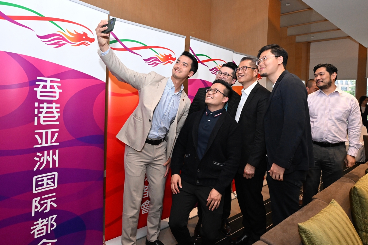陳茂波(右三)與香港青年企業家自拍留念。