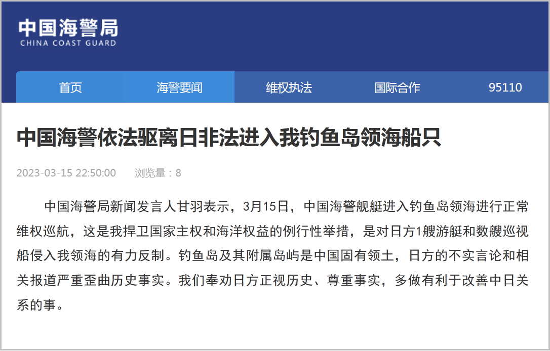 中國海警局官網截圖 當局重申,釣魚島及其附屬島嶼是中國固有領土,日方的不實言論和相關報道嚴重歪曲歷史事實。我們奉勸日方正視歷史、尊重事實,多做有利於改善中日關係的事。 另據日本共同社報道,3月15日2艘中國海警船在釣魚島海域行駛了約6小時50分鐘。其中1艘搭載了類似機關炮的裝置。日方指,在釣魚島周邊,已連續49天發現中國公務船。(完) 【編輯:王軼南】