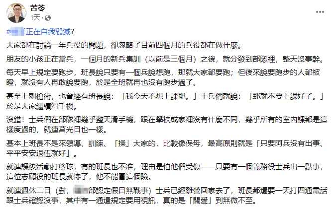 “苦苓”的這篇吐槽長文,也引來了不少台灣網友的討論。 有人認為只當兵4個月確實存在整天發呆、滑手機等情況;也有人表示“沒那麼誇張”,但當保姆是真的。