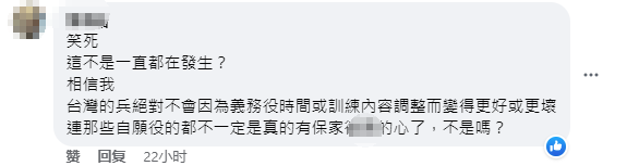 有台灣網友更犀利:“這不是一直都在發生?”認為台灣士兵不會因為役期長短或訓練內容調整而變得更好。4個月是“草莓兵”,1年還是“草莓兵”。