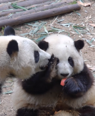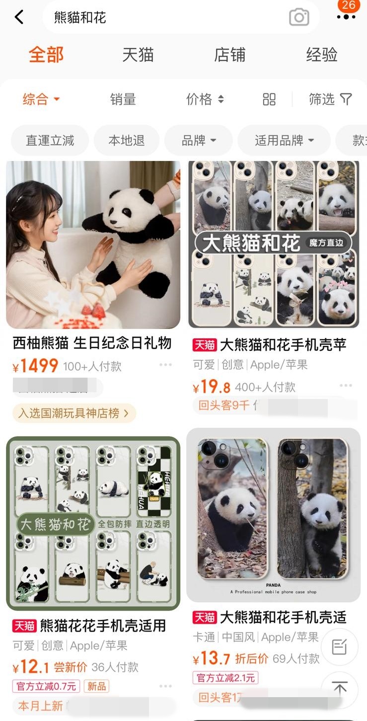 花花(右)。網圖 雌性大熊貓“和花”,小名“花花”,於2020年7月4日與雙胞胎弟弟“和葉”出生在成都大熊貓繁育研究基地月亮產房,初生時體重達200g。“花花”的下頷短、吻部尖、行動緩慢、不擅長爬樹。但憑著一臉呆萌模樣,笨拙的動作,走紅網絡,成為大熊貓界的“頂流”。社交平台隨處可見牠與飼養員“譚爺爺”的日常互動、淘寶上也都是“花花”的爆款周邊,部分玩偶更叫價超過1000元。甚至有多達5間公司趁著熱度,以“熊貓花花”的名字搶注商標。