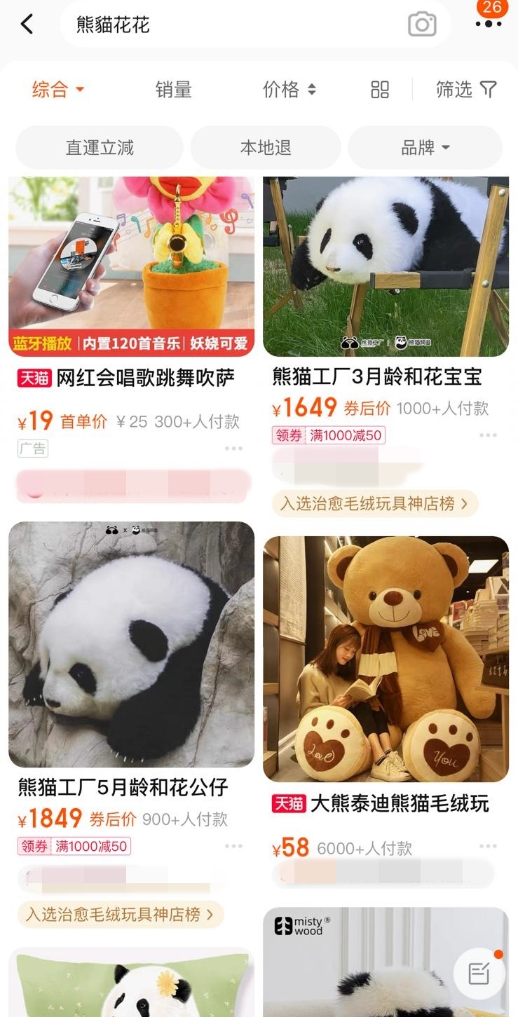 部分玩偶更叫價超過1000元。網圖 “花花”的爆紅,吸引不少人千里昭昭去成都大熊貓繁育研究基地探望。根據數字顯示,截至3月12日,成都大熊貓繁育研究基地3月的門票銷量,較去年同期增幅高達9倍,位列四川省內景區門票銷量第一,而全國景區銷量排名亦位列第五。 高流量同時也為“花花”帶來煩惱。不少遊客前往基地就是為了見“花花”一面,隨著人流愈來愈多,“花花”所在的區域常年被包圍得水洩不通。為免造成擠迫及意外,保安大哥天天拿著喇叭做疏通工作,硬生生被迫成“段子手”,“這裡那麼多熊貓,你們就看這一隻嗎?”、”你們對花花的愛太多了,把愛分給其他的熊貓一點吧”、“花花重要還是你們身體重要?”、“看不到花花的,可以上去看牠的老爸老媽”。
