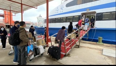 1月7日,“金瑞龍”客輪駛離廈門五通客運碼頭返回金門。圖源:新華社 陸委會副主委梁文傑稱,25日起台灣籍民眾、陸配可搭乘“小三通”及中轉,航班金廈航線每日1班調整為最多6班,金泉航線每周2班調整為3班;馬祖2條航線,由每周最多4班調整為14班。 大陸籍人士仍未開放搭乘“小三通”,梁文傑稱,涉及疫後兩岸人員健康有序交流之恢復,民進黨當局正持續檢討、評估。 因新冠肺炎疫情,陸委會自2020年2月暫停“小三通”,直至今年1月“春節專案”形式復航,僅限金馬民眾與當地陸配搭乘。此後該專案雖常態化執行,並增加船班,但搭乘旅客限制繼續保留。 據陸委會報告,2019年兩岸經“小三通”往來超過202萬人次,是2011年以來的新高;2001年通航以來,截至今年1月,客運總航次已經高達10.9萬次。(完) 【編輯:馬華】