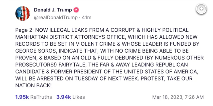 川普自曝明日會被捕 警方嚴陣以待防動蕩香港新聞網3月20日電 美國前總統特朗普在自創社交平台上自曝,預計自己將在明日(21日)遭到逮捕。 聲明全部用的大寫英文字母,且呼籲支持者采取行動上街抗議。特朗普的帖子發出後,海湖莊園附近出現了支持特朗普的標語。紐約市執法機構隨後開始加強警戒,以防可能出現的動盪,重演2021年國會大廈事件。 據特朗普在自曝文中寫道,根據曼哈頓地區檢察官辦公室的非法洩密,“遙遙領先的共和黨候選人的美利堅合眾國前總統,將於下周二被捕。” “抗議,奪回我們的國家!Protest, take our nation back!”他寫道。