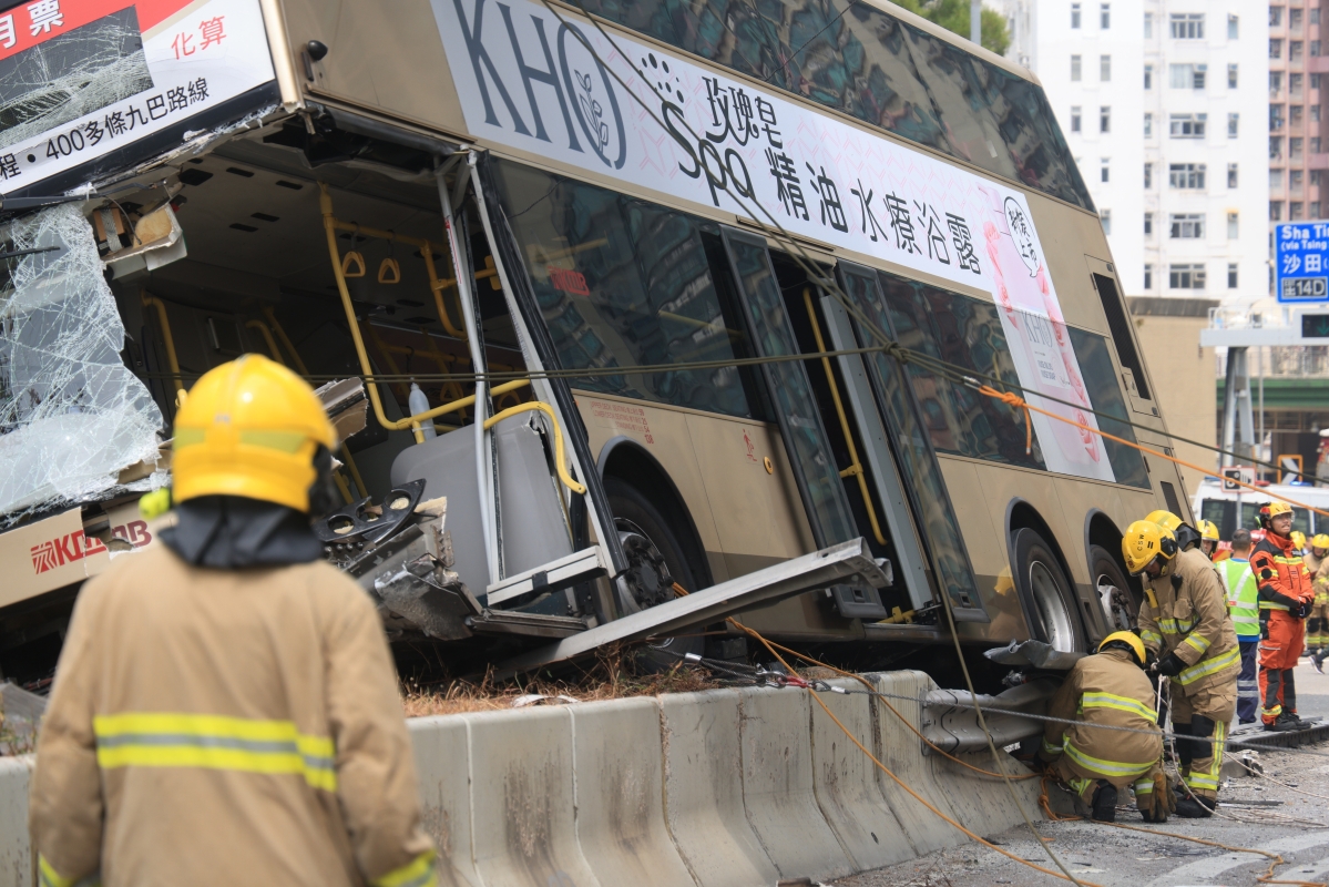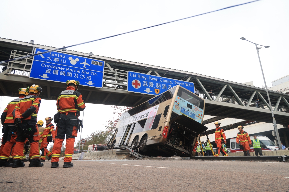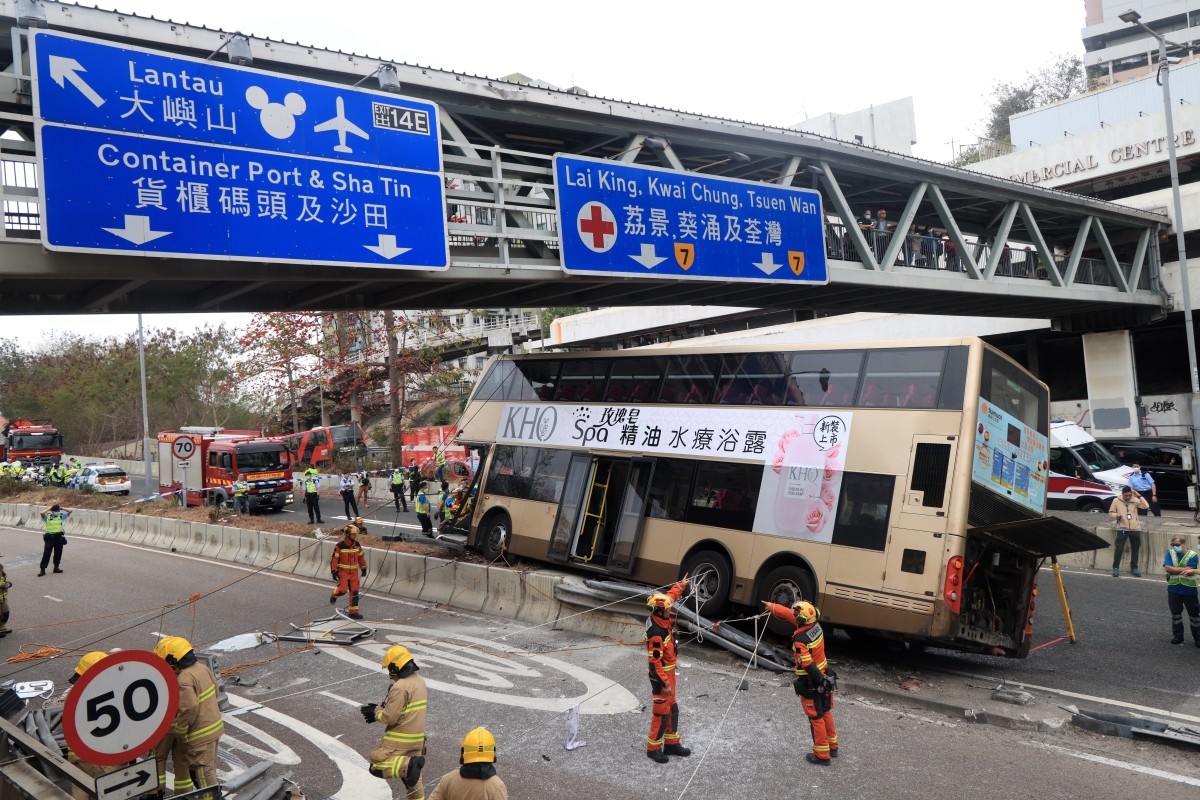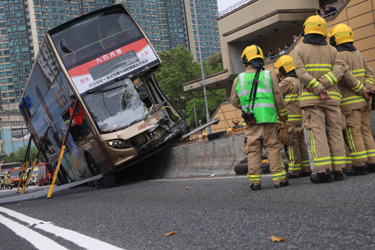 香港新聞網3月20日電(記者 許其皓)3月20日上午,香港呈祥道往荃灣方向,一輛載有77人的九巴巴士撞上石壆傾側,車頭和車身嚴重受損,巴士司機一度昏迷,巴士上層55名乘客被困於車廂內。警方和消防人員及時趕往現場展開救援行動,並將所有被困人士救出,至少有44名乘客受傷送院。