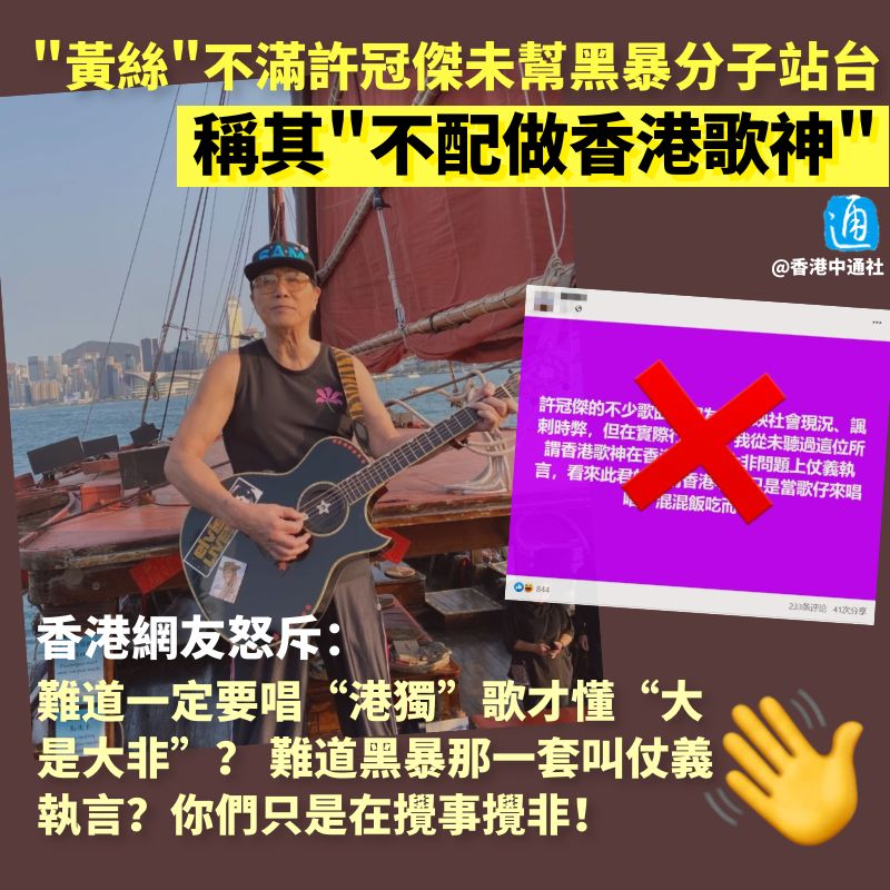 香港新聞網3月22日電 疫情緩和後,2023年有不少巨星在港開演唱會,其中就包括知名歌手許冠傑。然而,有“黃絲”留意,許冠傑從未為香港黑暴分子站台,遂陰陽怪氣地稱他的“香港心”只是用來混飯吃的,又質疑他“不配做香港歌神”…… 近日,有“黃絲”卻在社交媒體發帖,不滿許冠傑未為香港“發聲”,不配做香港“歌神”。帖文稱,許冠傑不少歌曲被認為是反映社會現況、諷刺時弊,“但在實際行事上,從未聽過這位所謂香港歌神在香港的大是大非問題上仗義直言。”指責許冠傑的所謂“香港心”“只是當歌來唱唱、混混飯吃而已”。