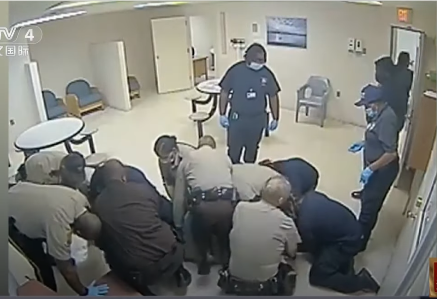 視頻截圖 據美媒報道,負責該案的丁威迪縣聯邦檢察官安·卡貝爾·巴斯克維爾表示,奧蒂諾死於警察和醫院工作人員身體壓制導致的窒息。巴斯克維爾指控涉事的7名警察和3名醫院工作人員在該事件中犯有二級謀殺罪。21日,丁威迪縣的大陪審團正式起訴了這10人。 視頻顯示,3月6日,至少7名警察拖著戴著手銬和腳鏈的奧蒂諾進入弗吉尼亞州中央州立醫院的一個房間,幾名醫院工作人員跟在後面。兩名警察將奧蒂諾壓到一把椅子上,奧蒂諾有所掙扎,旁邊的警察和醫院工作人員一起上前把奧蒂諾壓倒在地,有人壓腿,有人用膝蓋跪壓其上半身。最多時,奧蒂諾身上壓著8個人。 視頻顯示,在長達11分鐘的壓制後,這些人開始放開奧蒂諾,此時,奧蒂諾的身體已經不再動彈。醫院工作人員開始對奧蒂諾進行胸部按壓並使用心臟除顫器,但他一直沒有反應。 這一事件因與三年前黑人青年弗洛依德遭警察跪壓致死有著相似的情節,被媒體稱為“弗洛依德之死”再現。美國全國有色人種協進會(NAACP)在聲明中說:“患精神疾病不該被視為犯罪,當一個黑人不該被視為犯罪。”(完) 【編輯:林曉惠】