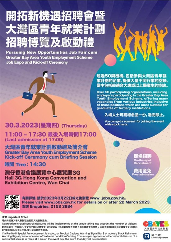 勞工處於3月30日在灣仔會展中心舉行開拓新機遇招聘會暨“大灣區青年就業計劃”招聘博覽。(政府圖片) 據香港勞工處消息,勞工處將於3月30日在灣仔香港會議展覽中心舉行開拓新機遇招聘會暨“大灣區青年就業計劃”招聘博覽,此次招聘會約有35間機構參加,提供超過2600個不同行業的職位空缺,其中逾1200個來自飲食、零售及酒店業。機構於會場設置櫃位,進行即場招聘,提供的職位包括高級銷售經理、會計主任、系統工程師、投資分析師、社區關系主任、船舶營運助理主任、飛機工程執照學員、電子商務助理、營養師、註冊護士、市場推廣助理和客戶服務主任等。職位空缺大部分月薪介乎12000元至23000元。約81%為全職空缺,約84%的職位空缺學歷要求為中七或以下,約68%的職位空缺無需相關工作經驗。 另外,“大灣區青年就業計劃”招聘博覽共有20多間來自不同行業的機構參加,提供超過400個在大灣區內地城市的職位空缺,當中包括管理見習生、行政主管、銀行營運業務員、新聞編輯、產品設計師、工程師和商業智慧分析師等,並以不低於月薪18000港元聘請合資格畢業生。2021至2023年獲頒學士或以上學位的香港居民可以申請有關空缺。“大灣區青年就業計劃”啟動禮及簡介會亦於同日下2時30分舉行。 求職人士可即場遞交職位申請,有機會即場接受面試,亦可在勞工處設於場內的櫃位查詢該處提供的就業服務。招聘活動於上午11時至下午5時30分在灣仔香港會議展覽中心展覽廳3G舉行,費用全免。截止入場時間為下午5時。求職人士如欲進一步瞭解空缺詳情,可瀏覽勞工處的互動就業服務網站。 (完) 【編輯:錢林霞】