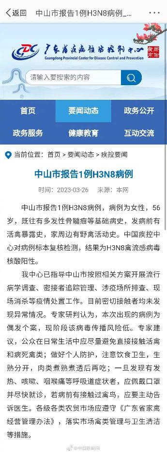 香港新聞網3月29日電 根據廣東省疾病預防控制中心消息,廣東省中山市報告1例H3N8病例,病例為女性,56歲,既往有多發性骨髓瘤等基礎病史,發病前有活禽暴露史,家周邊有野禽活動史。中國疾控中心對病例標本復核檢測,結果為H3N8禽流感病毒核酸陽性。