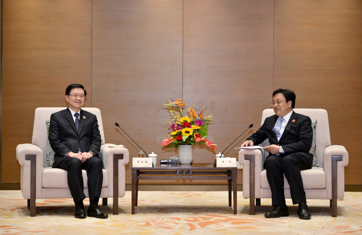 李家超(左)與海南省委書記兼省長馮飛(右)會面。 博鰲亞洲論壇全球自由貿易港發展論壇昨天上午公布《全球自由貿易區(港)伙伴關係倡議》,推動全球自由貿易區(港)加強合作。李家超表示香港特區支持並參與《倡議》,共同推動國內國際兩個市場兩種資源聯動效應,同時突顯香港作為貿易和投資自由化堅定支持者的角色。 李家超今日(30日)會出席博鰲亞洲論壇2023年年會開幕大會和博鰲亞洲論壇與海南省聯合歡迎晚宴,並繼續在海南的行程。(完) 【編輯:孟宜君】