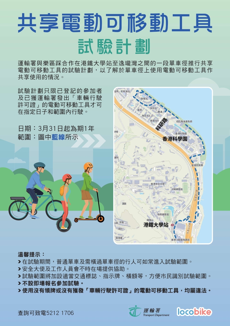 香港新聞網3月30日電 運輸署於今年3月31日起至明年3月30日與樂區踩(LocoBike)合作在白石角一段長約4公里、介乎港鐵大學站至逸瓏灣的單車徑上進行一項為期12個月的共享電動可移動工具試驗,以收集更多利用共享電動輔助單車於單車徑上作短途出行用途,往來工作/生活區至主要交通樞紐的運作經驗。 作一次性特別安排,樂區踩提供的共享電動輔助單車會附有運輸署發出的許可證,而樂區踩則已安排參加者登記,以安排於試驗期限及指定範圍內使用有許可證的共享電動輔助單車。運輸署強調,無預先登記的市民將不准參與試驗。而已登記的參加者使用沒有許可證的共享電動輔助單車,或在許可證指定範圍或期限以外使用有關電動輔助單車,均可能違反《道路交通條例》(第374章)及其附屬法例,以及其他相關法例。 市民請注意有關試驗安排,在該指定單車徑範圍騎單車及橫過該單車徑時需特別留意。現場將不時有大使向市民提供指引及所需協助。 (完)